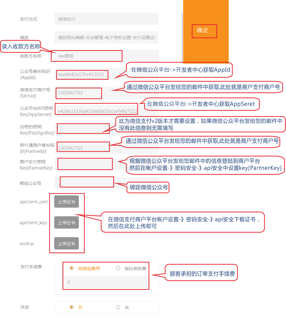 微信支付费率请参考 http://kf.qq.com/faq/120911VrYVrA140508FrMRZf.html 2.后台-》电子商务设置-》支付设置-》微信支付点击编辑。