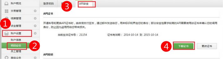 公众平台商户管理地址 https://pay.weixin.qq.com/ 登陆商户平台-》点击帐户信息-》密码安全-》api安全-》点击下载证书
