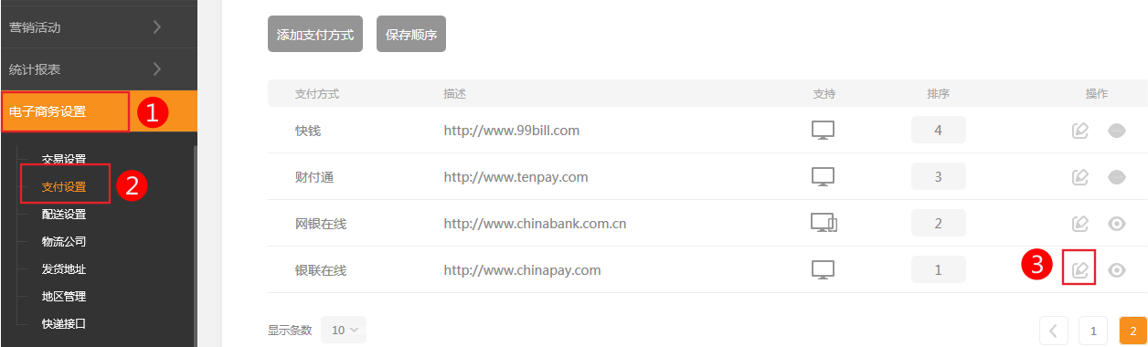2、签约成功后得到商户名称、商户帐号、商户密钥。然后回到网店中设置。 3、网店中设置流程。 1.依次点击电子商务设置->支付设置在银联在线中点击编辑。