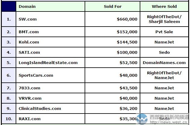 DN榜:极品域名sw.com以455万元霸气夺冠!多个短字符域名表现抢眼西部数码(west.cn)5月11日消息,本期的DN交易榜(5.1-5.7)上,短字符域名表现抢眼,排名前10的域名中,7成域名皆是四字符以下的域名。其中,极品两声母域名sw.com以660,000美元的价格荣登榜首,约合人民币455万元。 域名sw.com注册于1994年,距今已有23年历史了。作为两声母域名,sw.com代表的含义非常丰富,有“商务、生物、上网、食物、丝袜”等含义,在英文里可以是“西南”(southwest)、视频教程Solidworks等多个组合词的缩写,可以应用的空间非常广泛,市场价值也相当不菲。据了解,域名sw.com是由知名经纪人Sharjil Saleem中介交易的,三月份他还经手了域名asset.com(资产)。 排名第二的是三字母域名bmt.com,成交价为152,000美元,约合人民币105万元。这个域名由海外信托公司Bryn Mawr Trust收购,官网域名为bmtc.com。虽然目前bmt.com尚未启用,但相比于bmtc.com,bmt.com更加简洁易记,便于输写,而且与品牌形象、官网logo等更加契合。 紧随其后的kohl.com,以144,500美元成交,约合人民币99.5万元。该域名注册于1996年6月,距今已有21年历史了,在英文里是人名“科尔”的意思。目前对应有美国著名的专业百货公司——科尔士百货公司 (Kohl’s) ,官网域名为kohls.com。 同样以六位数美元成交的还有cvcv型域名sati.com,成交价为100,000美元,约合人民币70万元。据悉,该域名此前由一家生活服务类软件公司持有,三月底域名sati.com还可以访问,不过目前由于交易已经完成,网站也以关闭。另一枚cvcv型域名rati.com也以35,300美元的成交价跻身榜单前10。 除此以外,三个组合域名也颇具看点,其中字符较长的longislandrealestate.com成交价为52,500美元,人民币大概是36万元。这个域名虽然较长,但“长岛地产”的含义非常清晰,用来搭建地方性房地产平台最合适不过的了。另外,sportscars.com(跑车)、clinicalstudies.com(临床研究)均超3万美元成交。 本文转载自新闻资讯,原文链接:DN榜:极品域名sw.com以455万元霸气夺冠!多个短字符域名表现抢眼