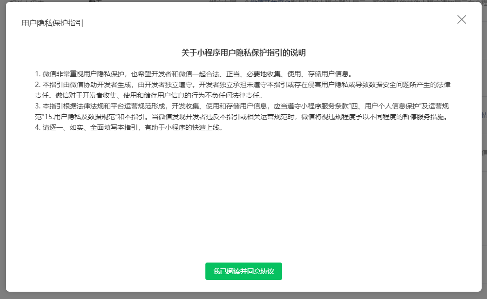 非代开发小程序用户隐私保护配置非代开发小程序的用户请登陆微信公众平台(https://mp.weixin.qq.com)在【小程序管理后台-设置-功能设置-用户隐私保护指引】自行配置 第一步:登录小程序管理后台在【设置-功能设置-用户隐私保护指引】点击【去完善】